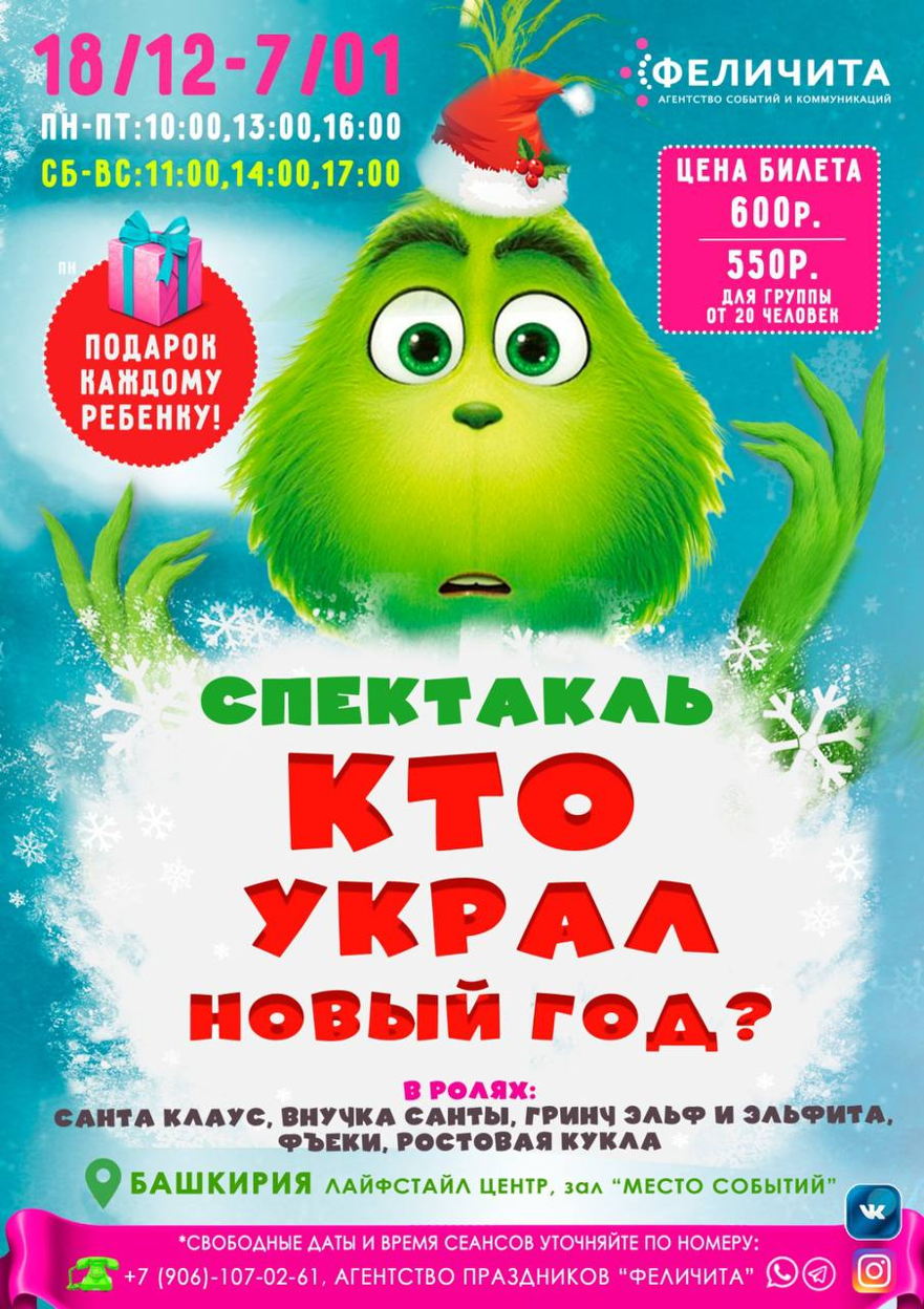 В этом сказочном представлении все будет иначе- Гринч заколдует ребят и похитит Новый год, но на помощь им придет команда новогодних героев: Санта Клаус, его внучка и озорные эльфы. Они снимут магическое заклинание и спасут праздник!